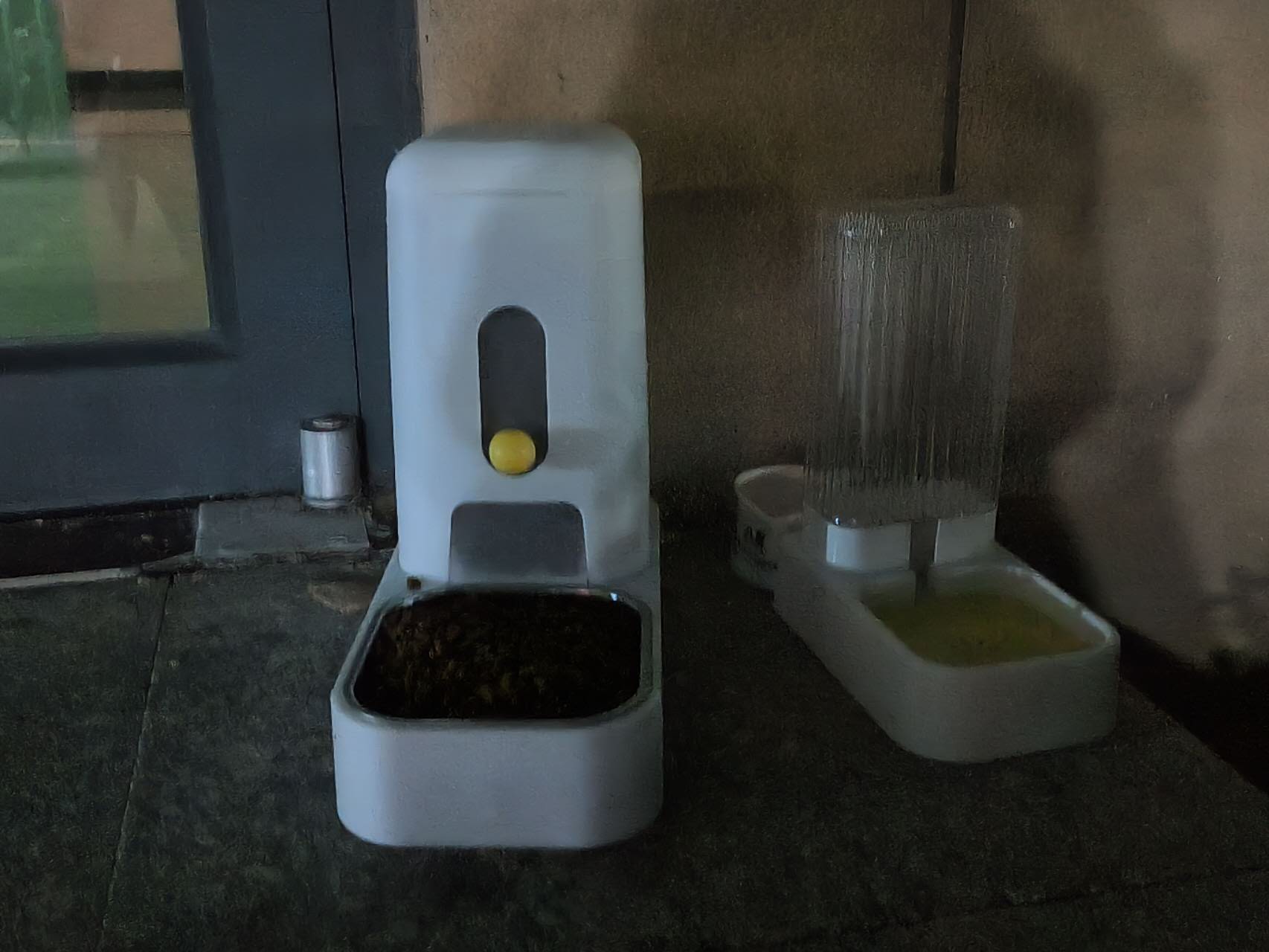 女寝配楼的侧门这里放了个喂食器,里面粮是满的,如果粮碗空了,可以把按钮...